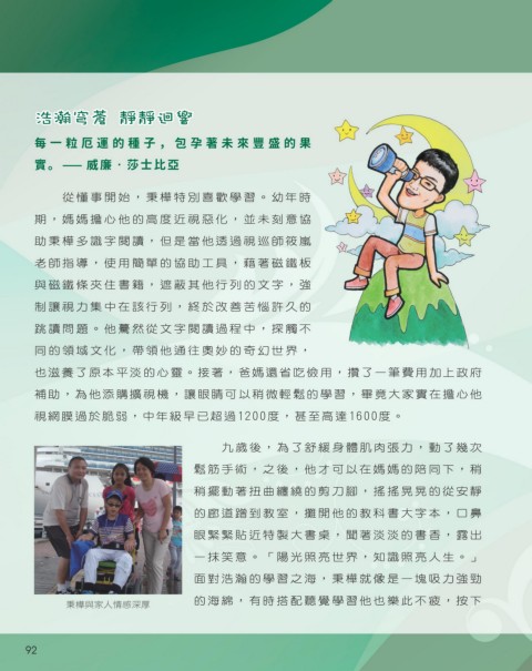 補助,為他添購擴視機,讓眼睛可以稍微輕鬆的學習,畢竟大家實在擔心他 視力急劇退化,必須仰賴擴視器才能閱讀書籍……