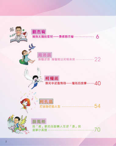 目錄 劉杰宥 吳秉樺 6 86 擁抱太陽的星兒—勇者劉杰宥 遨遊藍天的夢想家—吳秉樺 周沛辰 謝宇婷 無懼逆境 揮毫寫出光明未來 22 用愛的能量傾聽沉默 102 柯權祐 塗煜鈞 40 深具正能量 罕見小勇士— 微光中逆風飛翔—權祐的故事 塗煜鈞微笑邁進 116 柯孔晶 劉軒睿 打出自己的人生 54 溫暖而積極的小太陽 勇敢追夢的生命鬥士 130 薛禹希 張家儀 用「柔」軟的心翻轉人生逆「道」的 手球女孩精彩射門青春飛揚 146 追夢小英雄 70 2 3